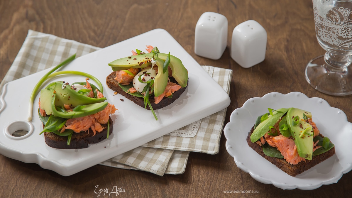 - Шаг 2На кусочки хлеба выложите листья шпината, лосось, авокадо. Сверху полейте йогуртом, посыпьте зеленым луком и сушеным чили.