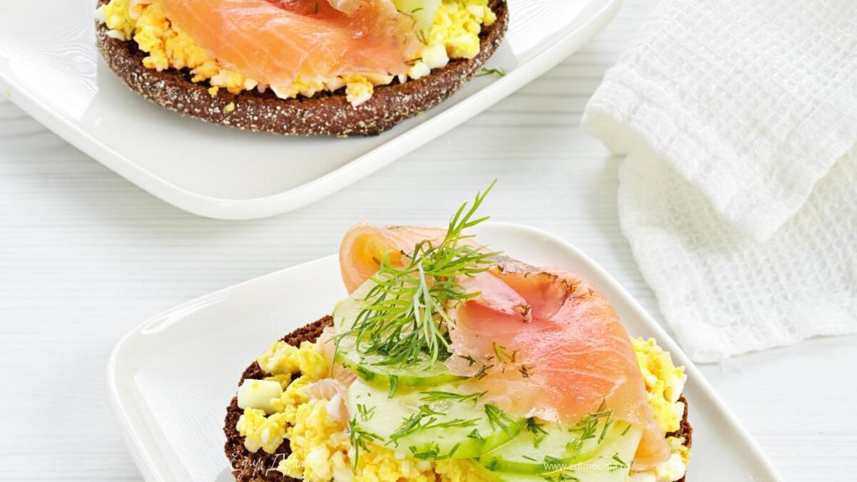 - Шаг 3Намажьте половинки хлеба Reissumies смесью масла с куриными яйцами, положите сверху огурчики и кусочек рыбы "Граавилохи". Украсьте бутерброд свежим укропом.