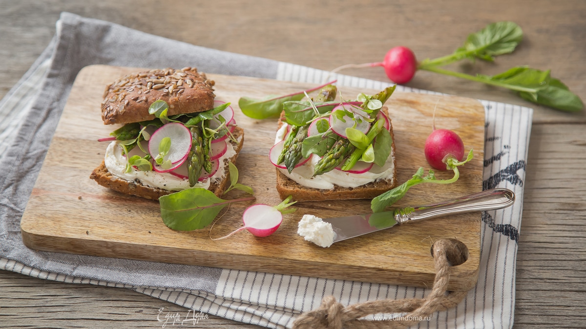 Шведские хлебцы со сливочным сыром, спаржей и редисом