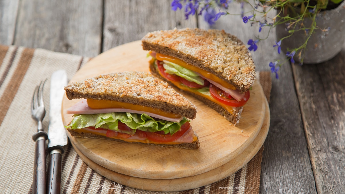 - Шаг 2На хлеб выложите кусочки сыра, ветчины, помидоры, салатные листья, сверху накройте вторым кусочком хлеба, слегка прижмите.