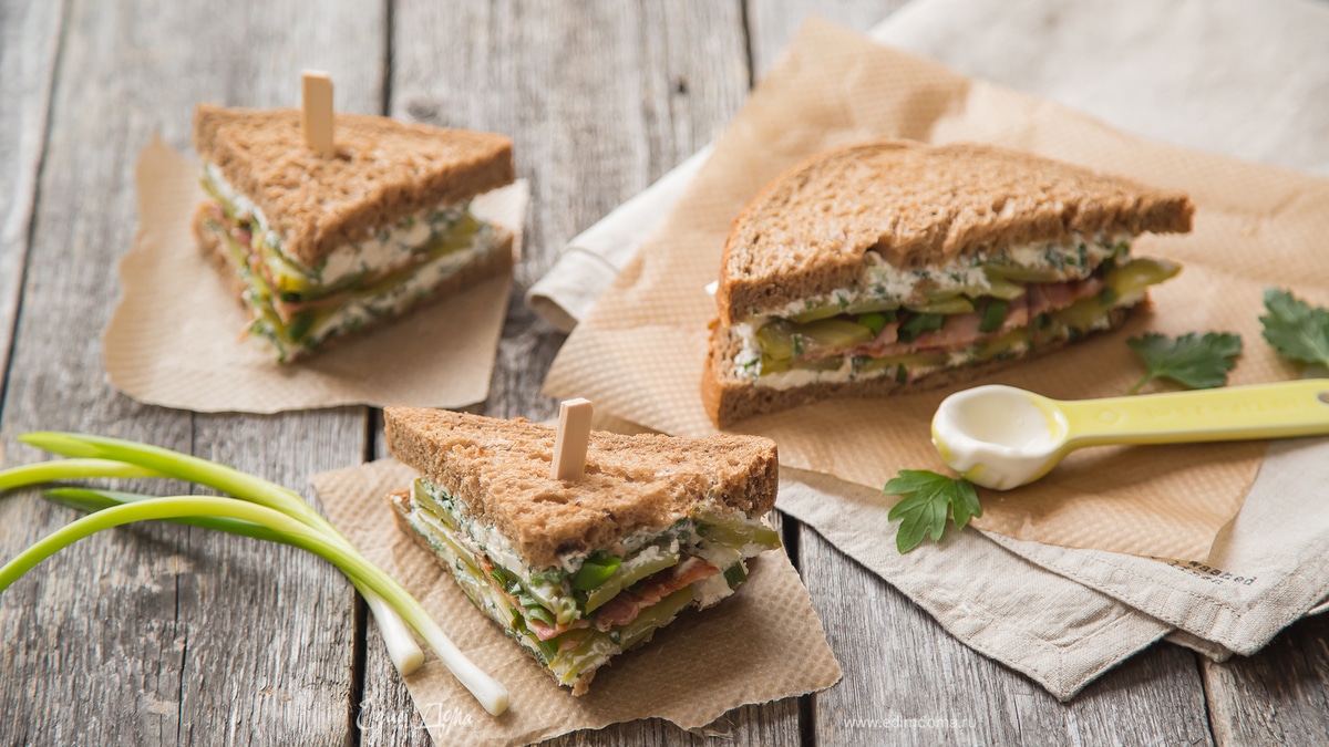 - Шаг 3На ломтики хлеба выложите фету, огурцы и бекон. Затем ломтики хлеба соедините друг с другом, чтобы начинка оказалась внутри, прижмите и разрежьте по диагонали на 2 части.