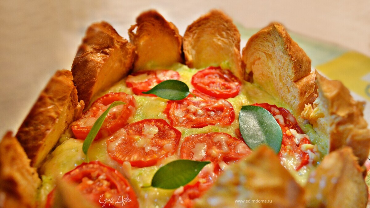 Сверху выложить нарезанный дольками помидор, посыпать оставшимся сыром и запекать около 40 мин при 180г. Если ломтики хлеба быстро подрумяниваются при запекании, то можно накрыть форму фольгой. - Шаг 8