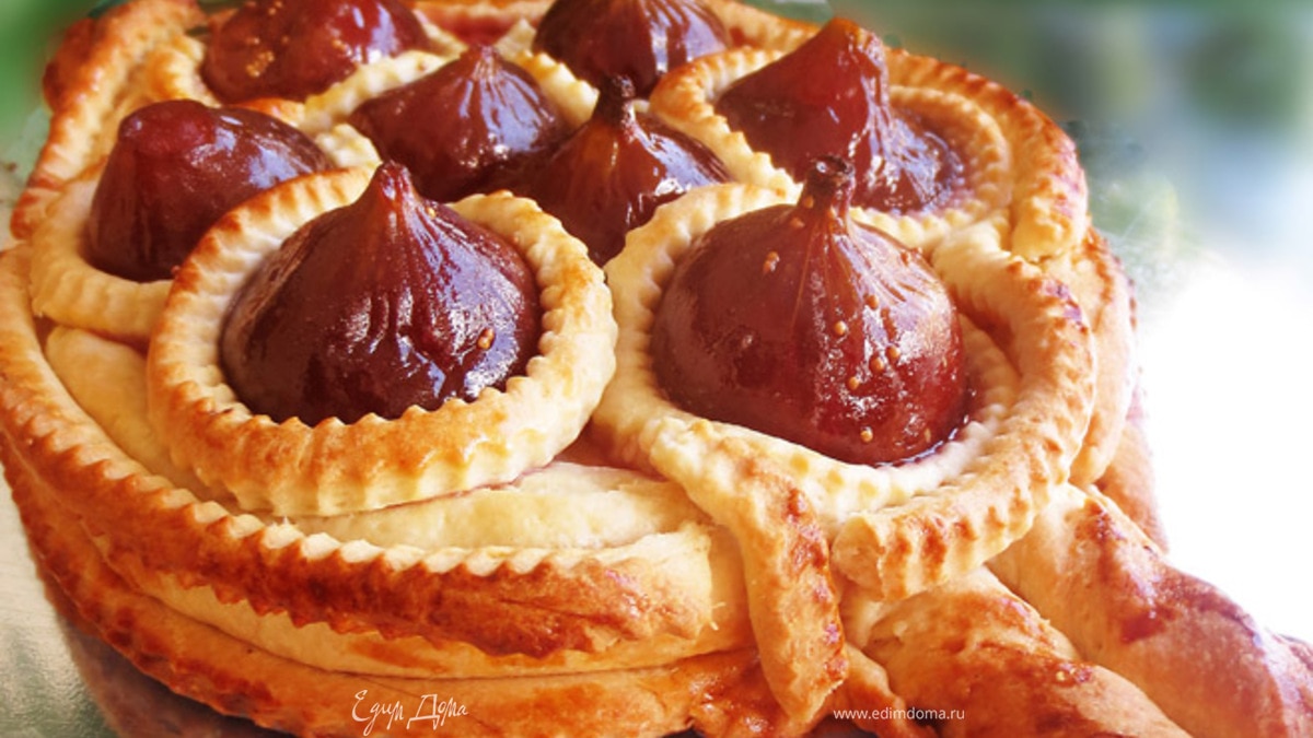 Выложить инжир в три ряда. Я использовала варенье из инжира. Обрезки теста собрать в шар, раскатать и фигурным ножом нарезать узкие полоски. Обвернуть полосками края пирога и инжир. - Шаг 7