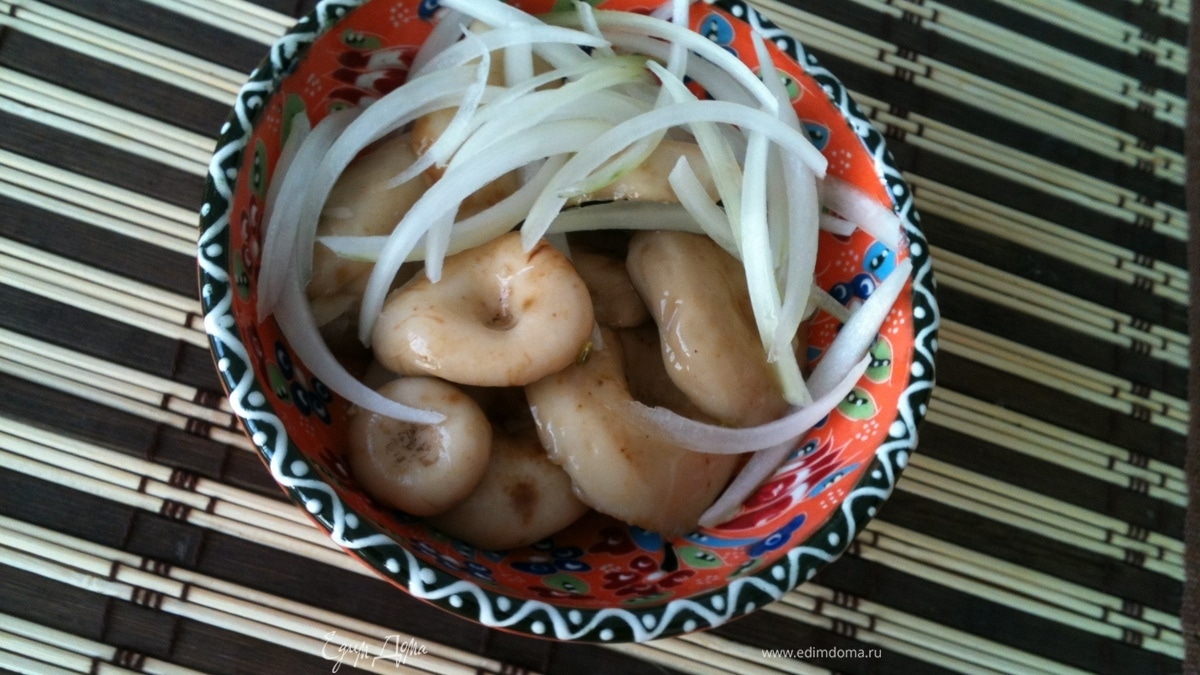 - Шаг 2Откинуть от воды, взвесить, добавить соли из расчета 2 столовые ложки на 1 кг отварных грибов, чеснок очищенный и нарезанный, вымытый укроп.