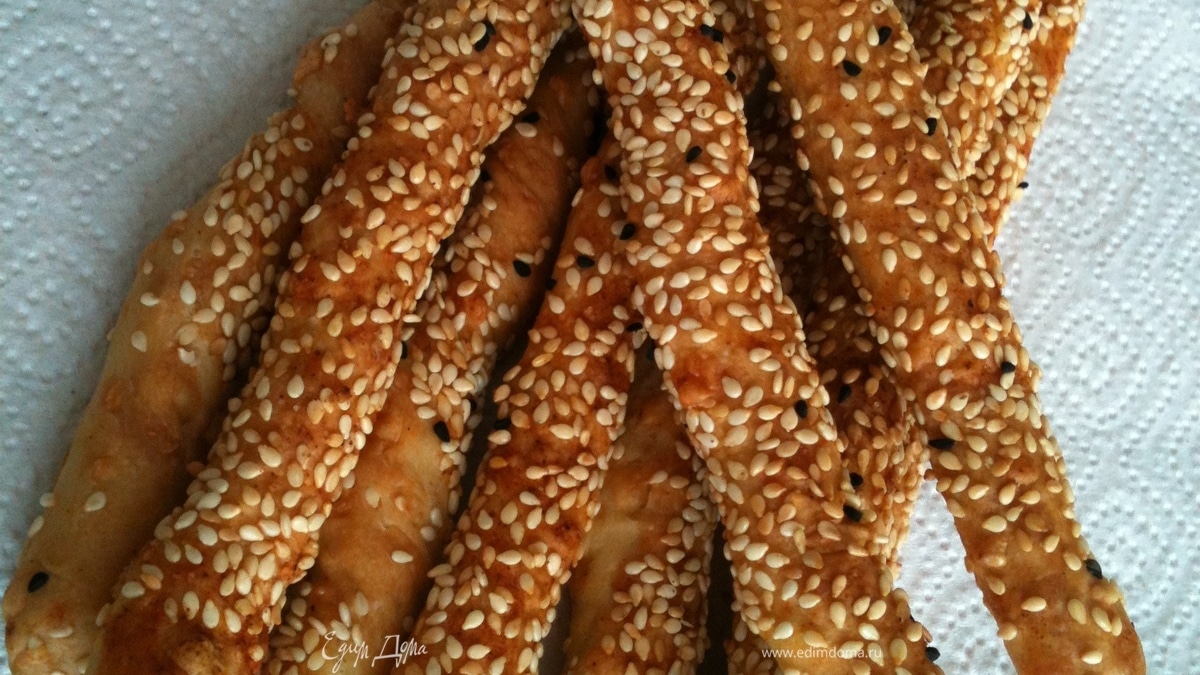 - Шаг 2Теперь раскатываем тесто в форме квадрата, посыпаем кунжутом и калинджи, слегка их вкатать в тесто, посыпать при желании перцем, нарезать тесто на полоски, сформировать палочки, уложить на противень и выпечь при 200 градусах до золотистого цвета.