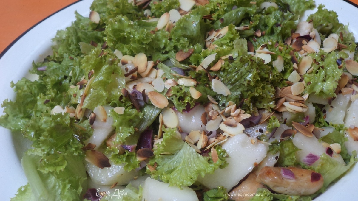 Для заправки красную луковицу мелко порубить. Перемешать оливковое масло, лимонный сок, сахар и сливки, перемешать. Посолить, поперчить, добавить измельчённый лук, перемешать. Салат полить соусом, перемешать. Посыпать салат орешками. Приятного аппетита!