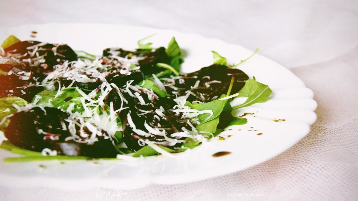 Вареную свеклу режем на кружочки. Руколу режем или рвем и выкладываем на тарелку. Сверху укладываем кружочки свеклы. Сбрызгиваем маслом и посыпаем тертым пармезаном.