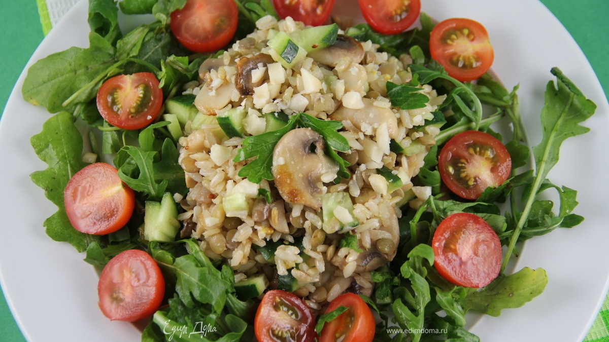 Рецепт этого салата я нашла у Делии Смит и он мне сразу приглянулся своим интересным составом и полезностью. Столько в нем всего: и питательная чечевица, и цельнозерновой рис, и грибы, овощи, и зелень, и орехи. Все вместе получается очень вкусно) Я приведу рецепт, как он был у Делии, у меня же под рукой не было нескольких ингредиентов, поэтому я сделала по-своему. Так, например, перец и зеленый лук я не добавляла, а вместо грецких орехов использовала макадамию. И заправку сделала немного по-другому, но суть от этого не меняется.