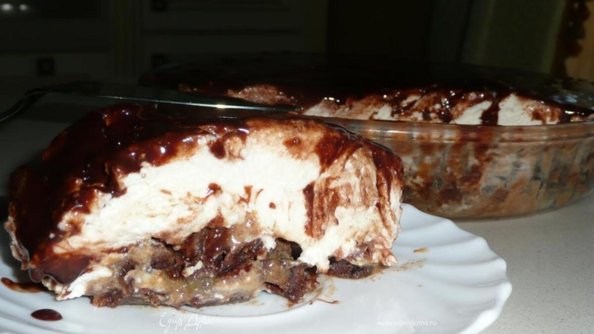 - Шаг 1Приготовление : 1.Желатин залить водой. Чернослив залить горячей водой или чаем на 30 мин, мягкий порезать на мелкие кусочки. Печенье истолочь(или искрошить кекс), добавить 150 мл глазури или растопленного шоколада, масло, чернослив, кофе. Все перемешать и выложить в форму. И полить оставшейся глазурью или шоколадом(50 мл).Убрать в холодильник. 2.отдельно взбить сливки с 0,5 ст сахара . Творог тщательно растереть с 0,5 ст сахара, соединить со сливками, ванилью и хорошо перемешать. Возможно мелкие крупинки останутся. Это нормально. Желатин растопить до растворения, не кипятить и влить в сливочно-творожную массу. Размешать и вылить на основу. В холодильник на 2-3 часа. Глазурь: Все ингредиенты аккуратно смешать и на медленном огне при постоянном помешивании растворить, не кипятить.Охладить. Еще немного теплой покрыть торт. Готовый торт полить шоколадной глазурью.