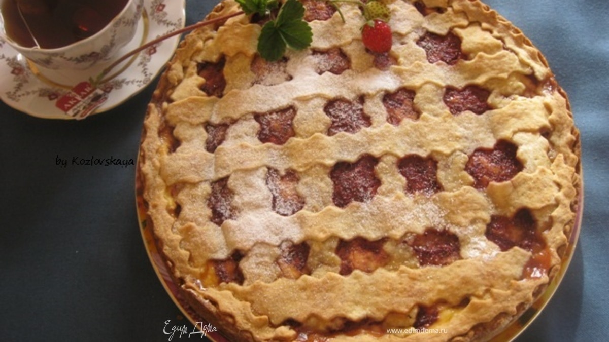 Оставшееся тесто на пергам.бумаге раскатать пласт, нарезать на полоски. Накрыть полосками пирог и закрепить края. * У меня осталось чуть-чуть теста, я также нарезала полосочки и выложила по кругу пирога, чуть-чуть придавливая. Выпекать 40-45 минут. - Шаг 10