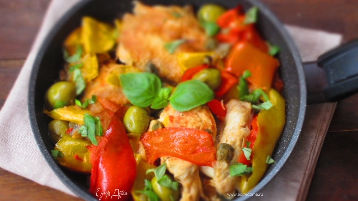 Выложить курицу в сковороду к луку, добавить перец, оливки, каперсы и оставшуюся веточку розмарина. Посолить и поперчить по вкусу. Обжарить 5 минут, затем влить 250 мл маринада, накрыть крышкой и готовить 45 минут на слабом огне. - Шаг 6