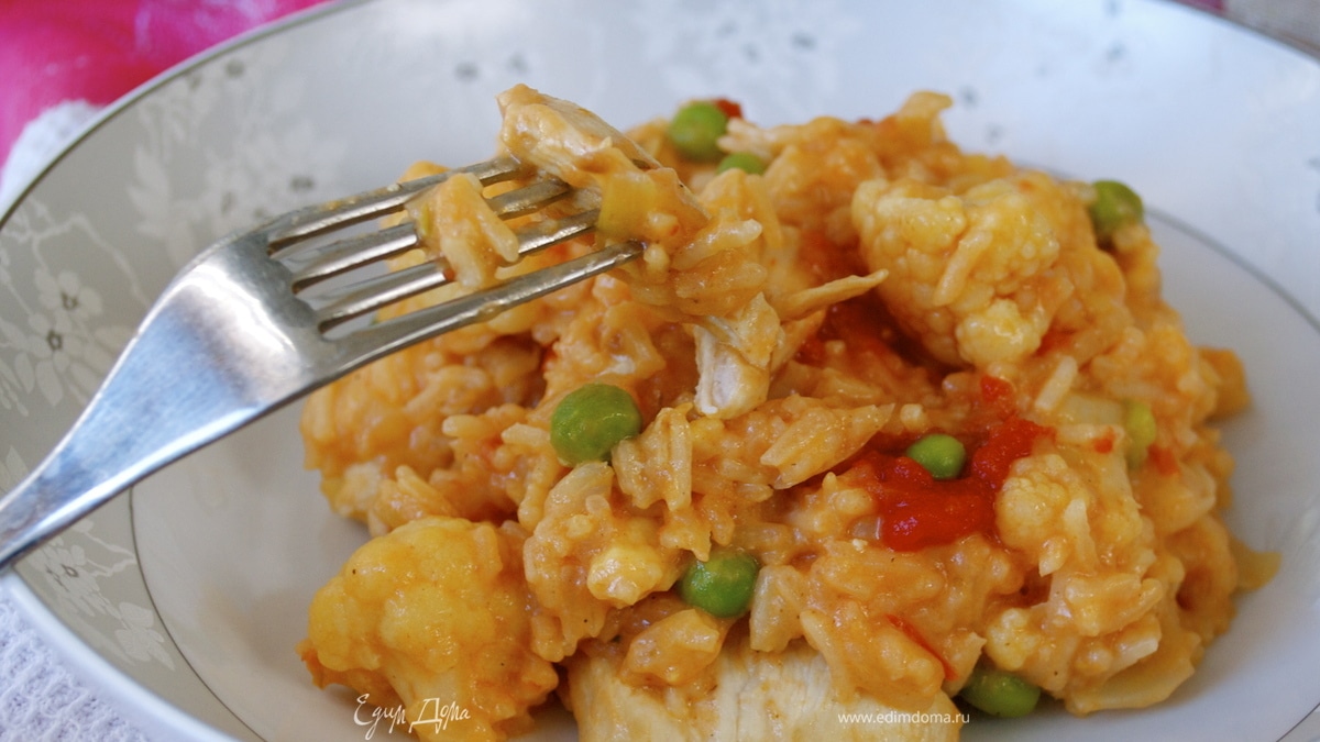 Соцветия цветной капусты и пряный соус превращают этот плов в необычное блюдо! )) Используем готовый СОУС КАРРИ..., в ингредиентах его не было! Изюм кладите по желанию. Я изюм не кладу в это блюдо. ![]()
