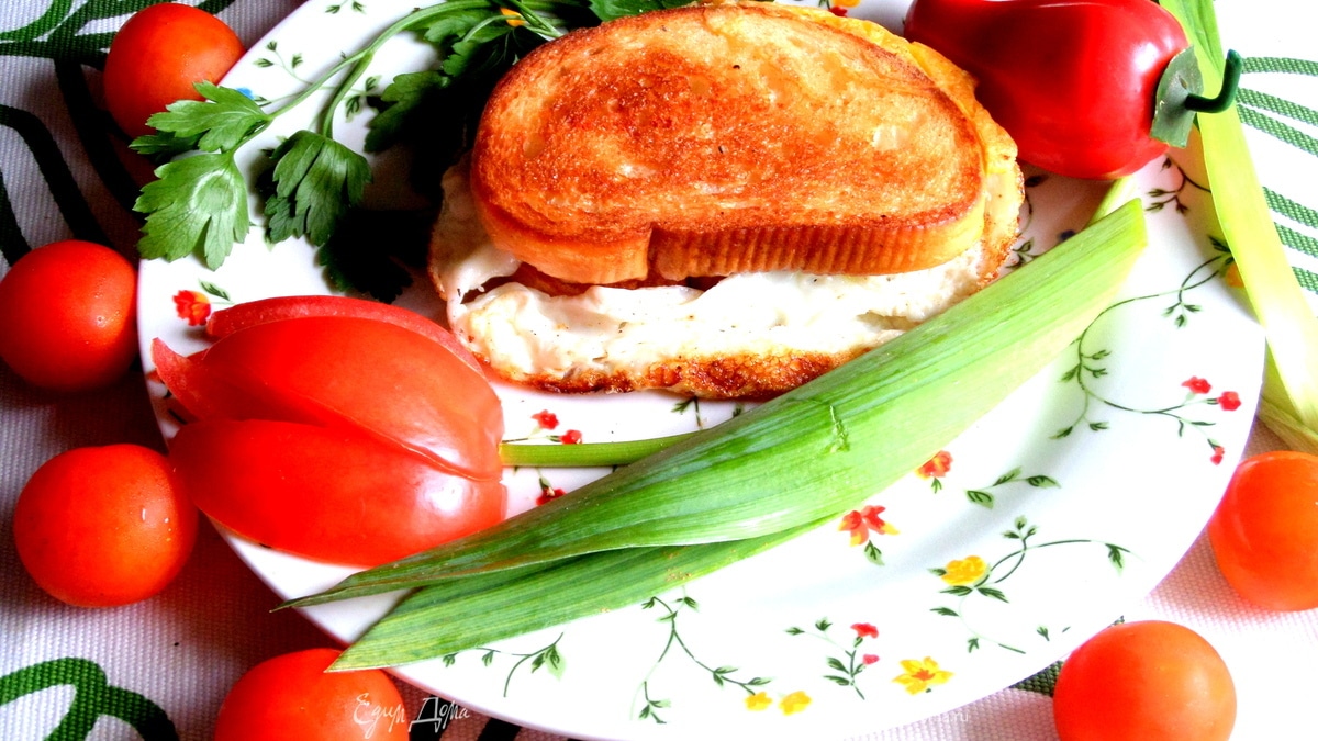 Переносим на тарелку сначала простую гренку,а сверху яичную. - Шаг 5