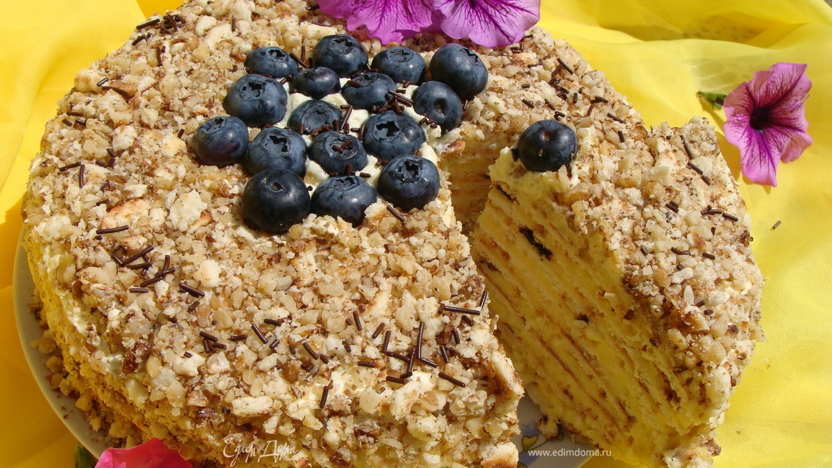 Этот рецепт мне попался, когда стояла жара и совсем не хотелось включать духовку. Обстоятельства сложилось так, что я не смогла вовремя поделиться рецептом с вами. Надеюсь, что лучше поздно, чем никогда. Этот десерт относится к категории «просто, быстро и вкусно», из незатейливых продуктов получается вкусный десерт. Отличный тортик для семейного чаепития в выходной день. Коржи из творожного теста пропитываются моим любимым кремом и настаиваются ночь в холодильнике. Торт легко режется на кусочки, получается не сухим, но и не влажным, для тех, кто любит наполеоны, медовики и др. подобные торты.