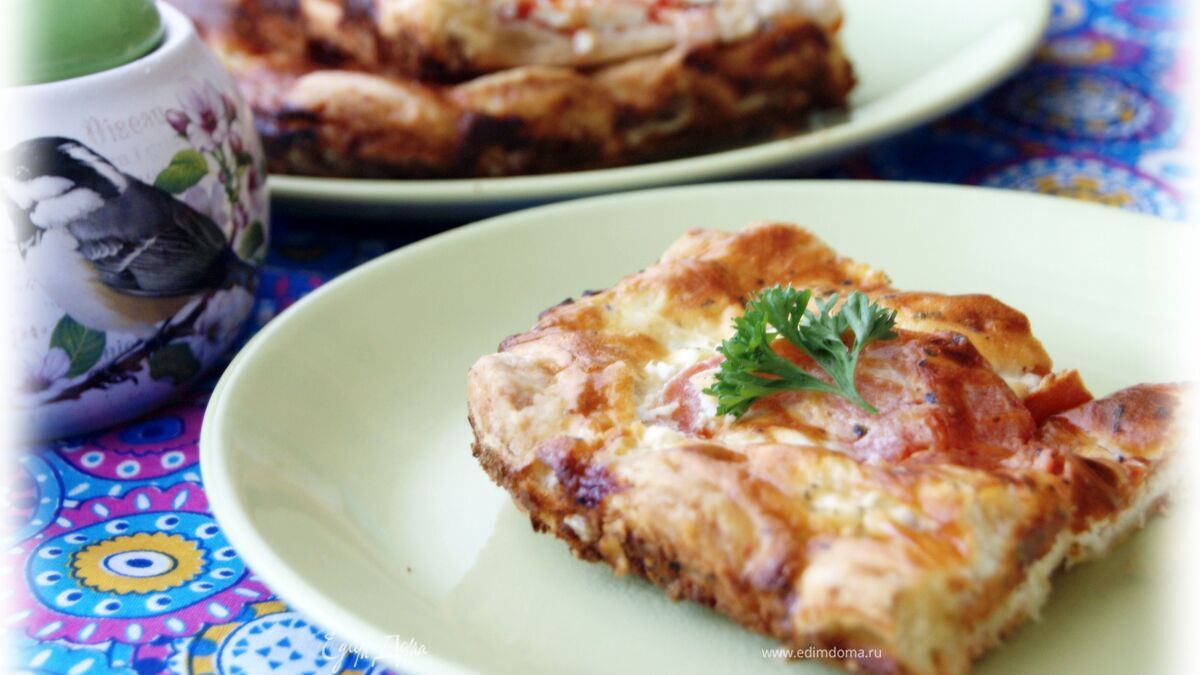 Начинка из помидор на тонком хрустящем сырном тесте в сочной заливке, это просто фантастика