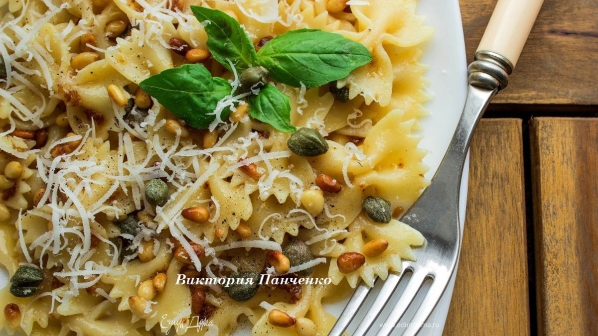 Фарфалле с печеным чесноком, кедровыми орехами и каперсами (для елены ковач)