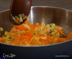 Обжаренные овощи добавить в суп и варить до готовности перловки.