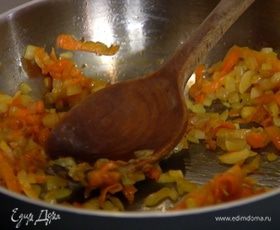 Морковь почистить, натереть на крупной терке, добавить к луку с чесноком и, помешивая, обжарить.