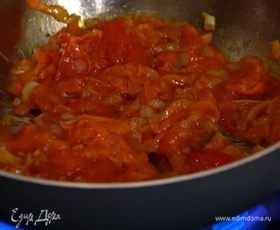 Консервированные помидоры выложить в сковороду к овощам, перемешать, немного прогреть и снять с огня.