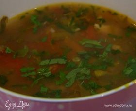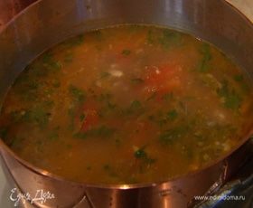 Куриный бульон лучше сварить заранее, добавив в него лук, морковь, стебель сельдерея, лавровый лист и можжевельник, но не чеснок! Перловку можно заменить рисом, а кинзу — петрушкой. Вместо консервированных хорошо добавить 2–3 очищенных от кожицы и мелко нарубленных сладких свежих помидора и чуть-чуть томатной пасты — суп получится гораздо нежнее!