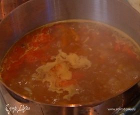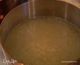 Перловку промыть, просушить, всыпать в горячий бульон и немного поварить.