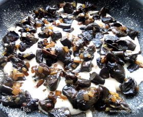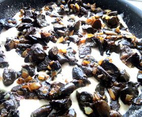 Обжариваем грибы с луком и приправами,распределяем несколько ложек на первый слой теста.