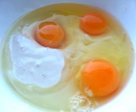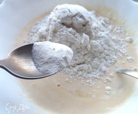 Муку с разрыхлителем,соль,если преобладает сметана. Перемешиваем массу.