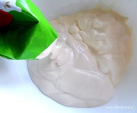 Тесто всем знакомо,для него смешиваем в равных (или примерно равных) пропорциях сметану и майонез.