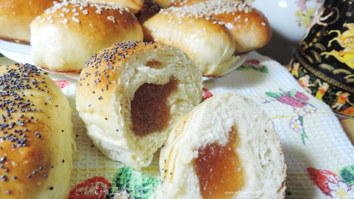 У меня в этот раз пирожки с вкуснейшим домашним яблочным повидлом. Оно у меня очень густое, практически мармелад, поэтому попыток к бегству не предпринимает. Если у вас повидло совсем жидкое, можете заранее проварить его с загустителем типа на основе пектина, пропорции смотрите на упаковке.