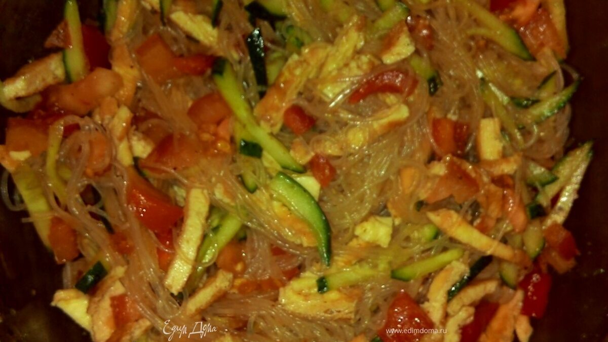 Смешать овощи с лапшой. Полить салат заправкой и соевым соусом. Готово! Приятного аппетита!