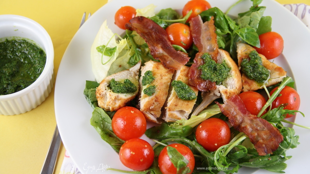 По 4 тарелкам раскладываем салатные листья с помидорками черри. Курицу режем кусочками и выкладяем сверху. Украшаем беконом и поливаем заправкой из свежих трав. И подаем. Приятного аппетита))