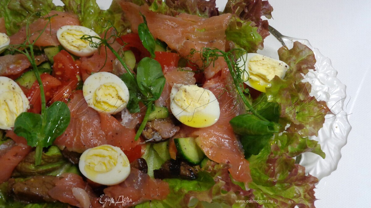 Вкусный, сытный и яркий салат, который вполне может заменить ужин. Много зелени, овощи, грилованные баклажаны, лосось холодного копчения и перепелиные яйца -