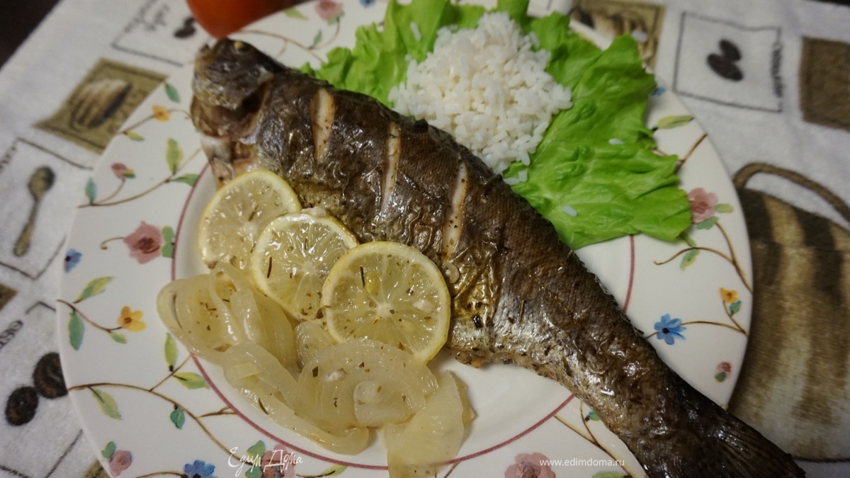 Посолить , поперчить, натереть специями и растительным маслом. В брюшко положить веточку розмарина и пару долек лимона. Противень застелить фольгой выложить порезанный кольцами лук (можно положить любые коренья или овощи например пастернак, морковь, болгарский перец). Овощи предотвратят прилипание рыбки к фольге и пропитают ее вкусными ароматами. Запекаем рыбу в духовке при 200 градусах. - Шаг 2