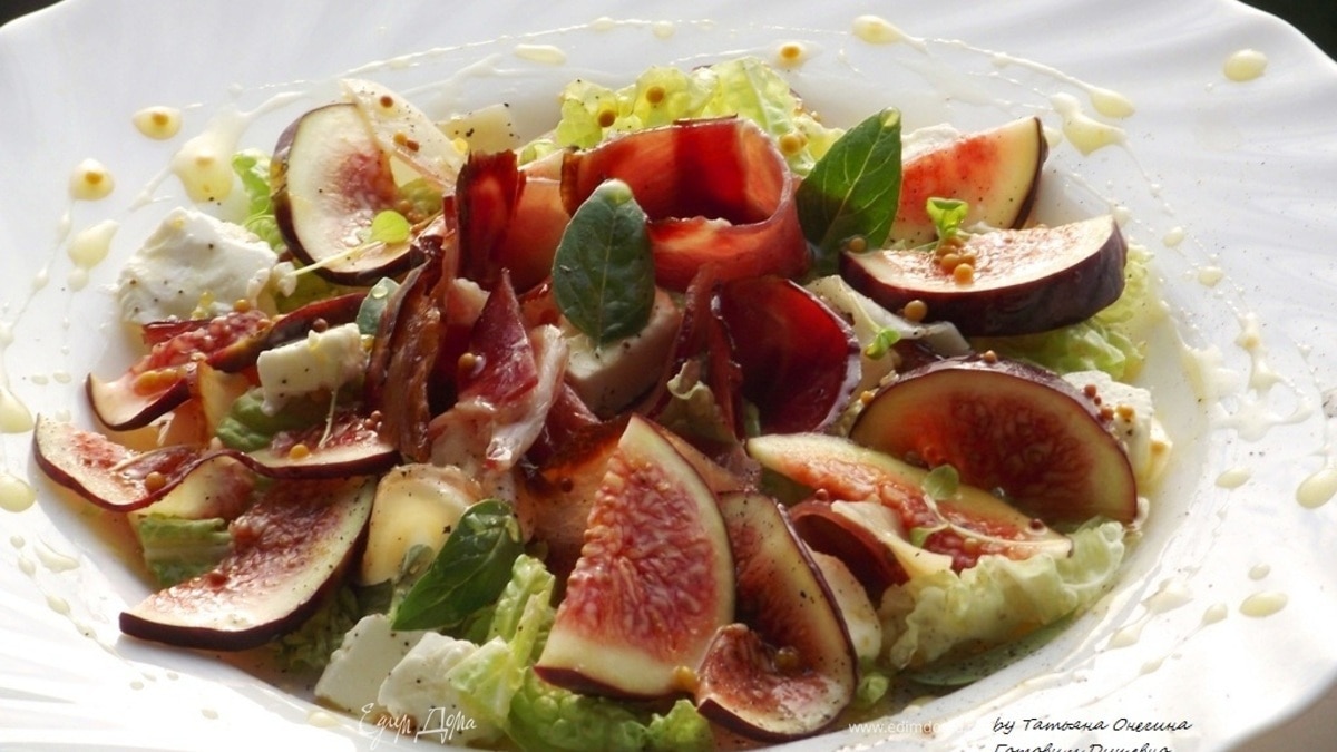 Ингредиенты для такого салата можно дополнять, например — разнообразить малиной, голубым сыром, орехами, семенами кунжута, виноградом, мятой… Главное, чтобы основным ингредиентом оставался инжир, а все остальные дополняли «настроение» салата