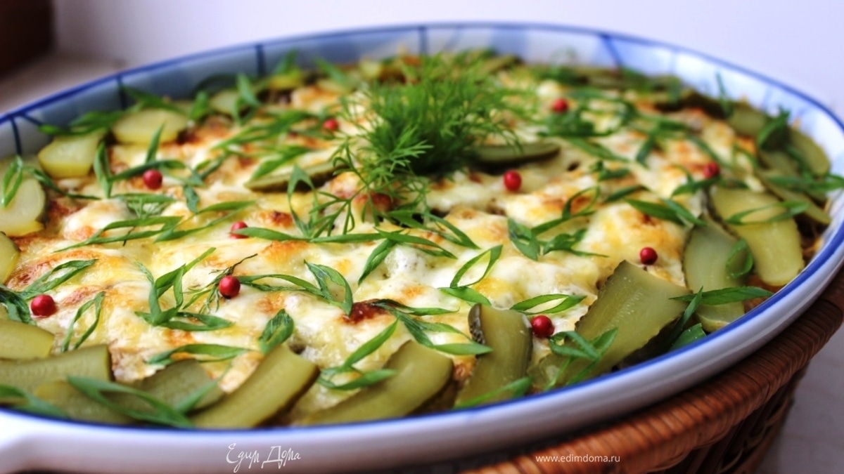 Украсить по своему усмотрению. Я предлагаю подать маринованные корнишоны, укроп и зеленый лук.... Они очень хорошо сочетаются с картофелем и мясом. Перед сервировкой лучше выдержать запеканку в течение 15 минут, чтобы все слои схватились и немного держали форму. - Шаг 10
