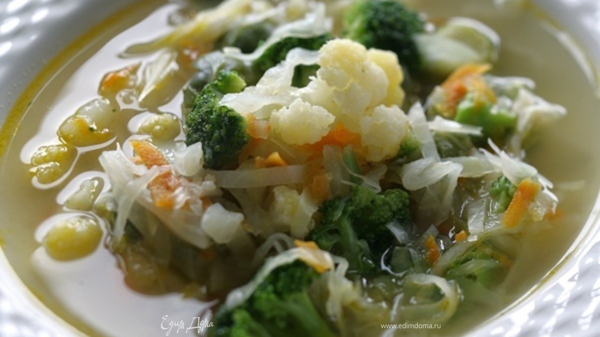 Цветную капусту и брокколи разделить на небольшие соцветия. - Шаг 7Опустить в бульон брокколи, цветную и белокочанную капусту, посолить суп и варить до готовности овощей.