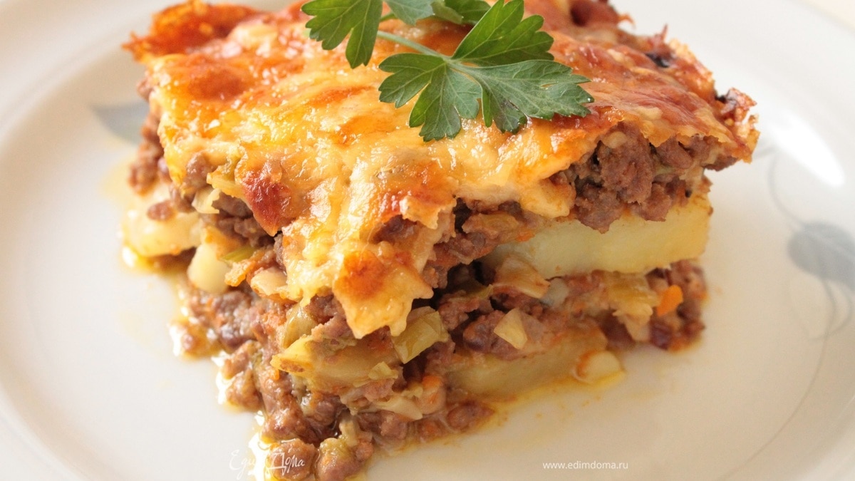 Запеканка из говяжьего фарша с луком-пореем и картофелем