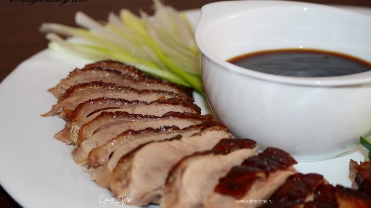 - Шаг 4Готовую утку нарезаем ломтиками (только мясо, каркас утки оставим для бульона) и подаем на блюде с блинчиками из пшеничной муки, зеленым луком, свежими огурцами и соусом "хой-шин".