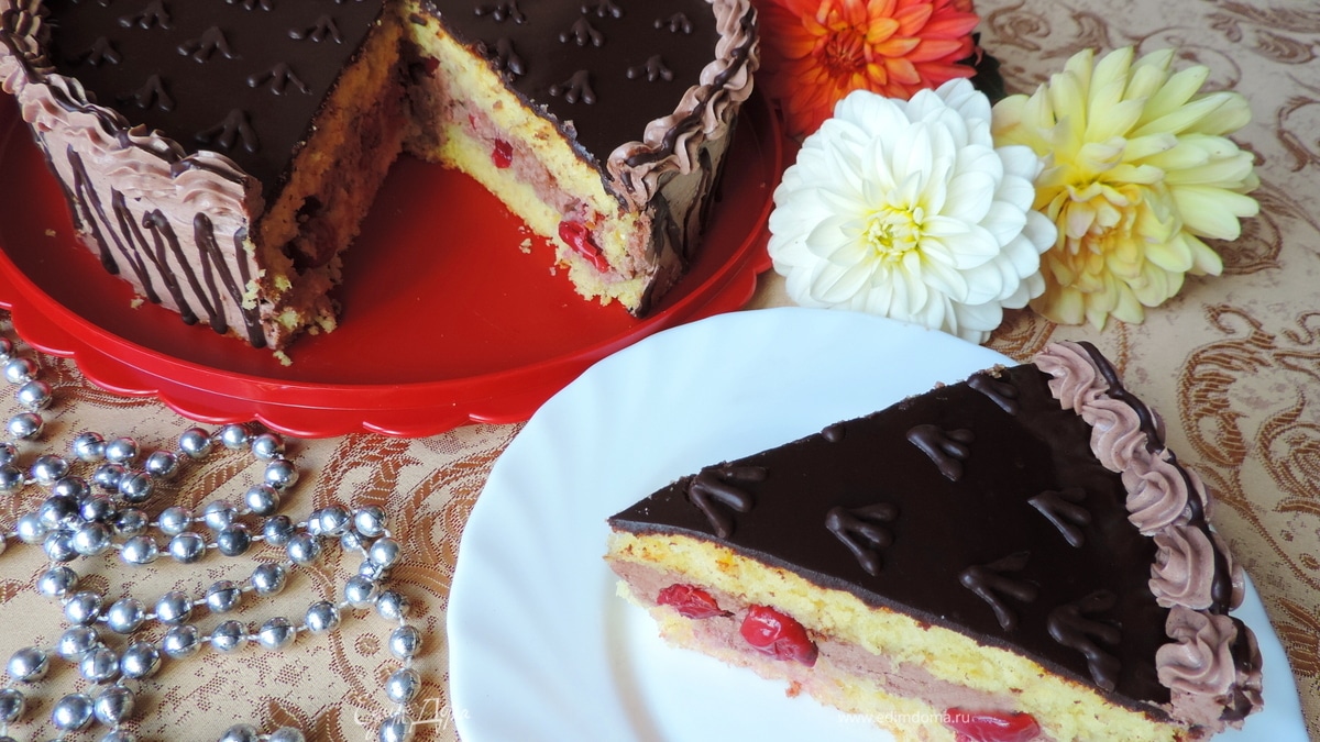 Количество бисквита увеличила вдвое и заменила на свой проверенный, наконец приготовила крем по оригинальному рецепту, добавила глазурь и украшение. Вишню предварительно вымочила в коньяке, чтоб придать торту "изюминку".