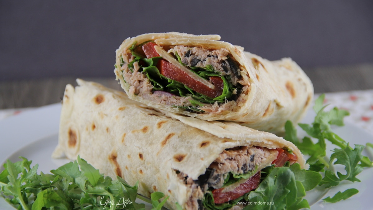 На лепешки выкладываем салат из тунца. сверху салатный микс и пару долек помидорами. Сворачиваем их, разрезаем напополам и подаем.