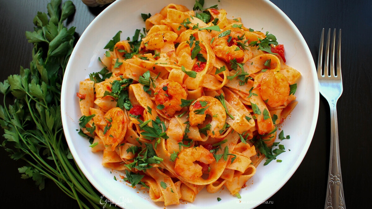 Паста феттучине с креветками и томатами