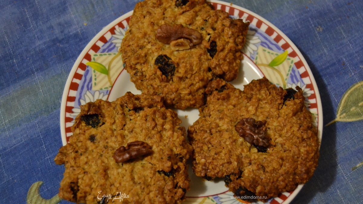 Овсяные хлопья обжариваю на сковороде 10 минут. Ставим остудить. - Шаг 1Размягченное сливочное масло, взбиваем в пену с сахаром. Изюм запариваем. Затем добавляем яйцо, муку, орехи, изюм, цедру лимона, соль. Тщательно перемешиваем.