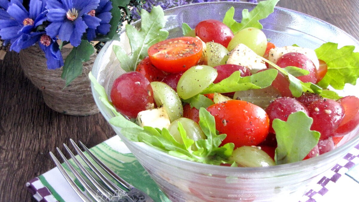 Темный и светлый виноград лучше взять без косточек. Если виноград с косточками, то разрезать пополам и удалить косточки. Выложить в салатник.