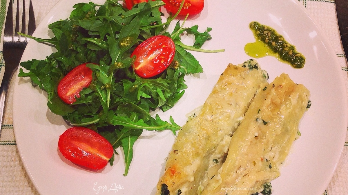 Я подавала каннеллони с салатом из руколы с помидорами и соусом песто. Приятного аппетита!)))