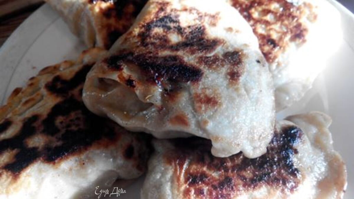 Каждую часть теста раскатать в тонкую лепешку диаметром примерно 22-23 см. На нее распределите тесто закрыв 3/4 части лепешки. (что б осталась четвертинка лепешки без фарша) От края до центра сделать надрез и загнуть четвертинку без теста что б накрыть им 1/4 часть начинки. Получить 3/4 от круга , далее еще раз накрываем так, что бы у вас получилась половинка круга. И еще раз,получается конвертик (1/4) Залепляем края и жарим на сухой сковородке 5 минут. Поливаем растопленным сливочным маслом.