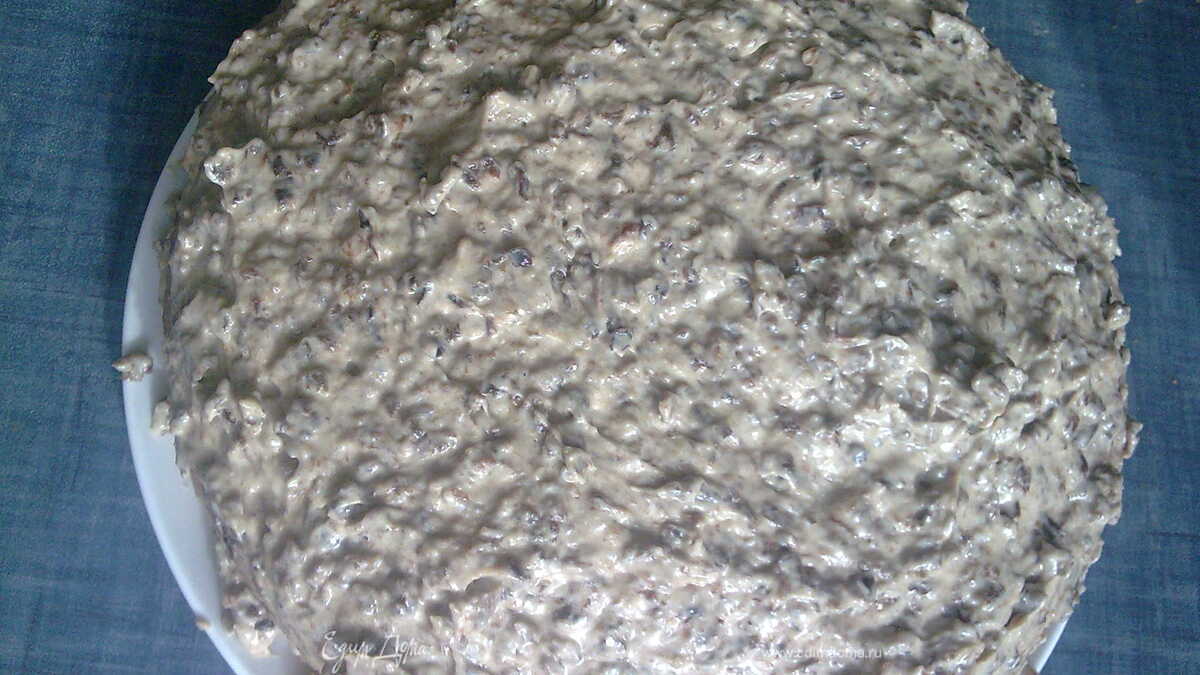 - Шаг 1Яйца взбиваем с сахаром,добавляем мед, соду, муку. Все хорошо перемешиваем. Тесто должно быть не очень густое, чтобы растекалось равномерно по форме. Визуально делим на 3 части. Форму мажем маслом, посыпаем слегка мукой и выливаем тесто. Выпекаем до готовности (10-15 мин). Должно получиться 3 коржа. Остудить их. Мягкое масло растираем с сахарной пудрой. Понемногу добавляем перекрученный через мясорубку чернослив и молотые орехи. Промазываем коржи и даем настояться 2-4 часа.