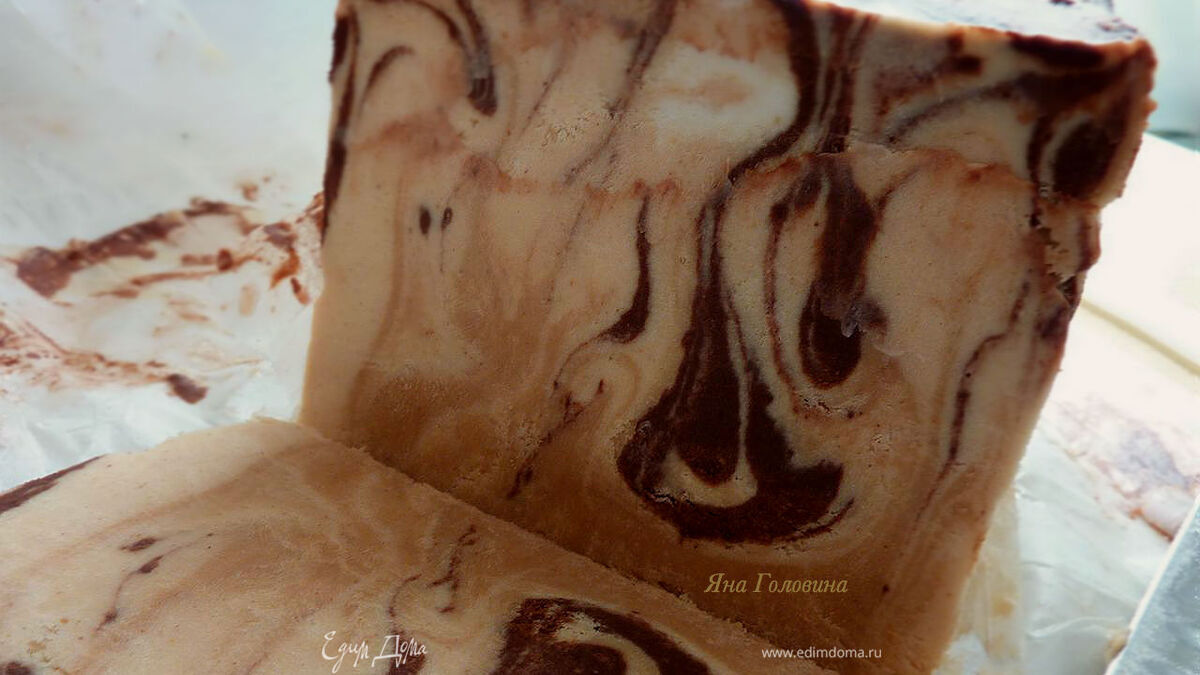 Залить оставшимся кремом и полить ещё 1/4 стакана шоколадной смеси. Палочкой или ножом не много перемешать для мраморного эффекта. - Шаг 8