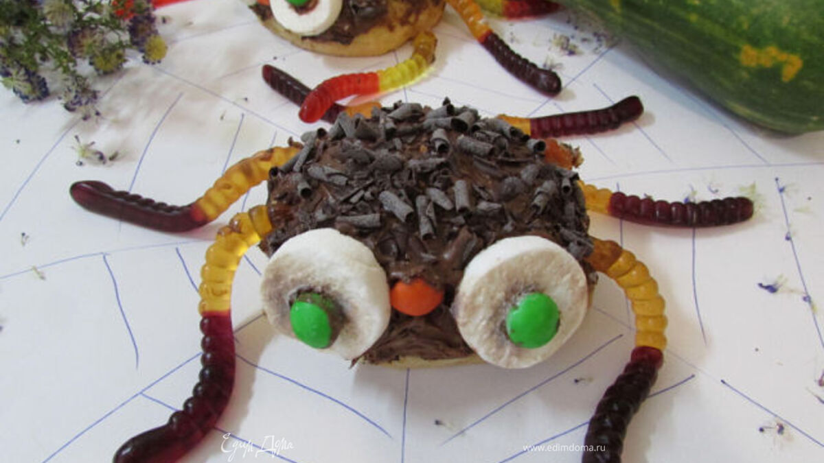 Один из ярчайших символов заморского праздника Хэллоуина – пауки. Предлагаю испечь булочки-паучки (рецепт нашла в Интернете, к сожалению, автор не указан). Эти паучки - красивые, с волшебной начинкой и очень вкусные. Детки точно не испугаются, а с удовольствием их скушают с чашечкой тёплого молочка.