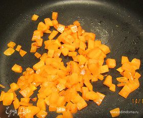 В сотейнике разогреваем небольшой кусочек сливочного масла и 1 ст.л. оливкового масла. Готовим порезанную мелкими кубиками тыкву до мягкости минут 10. В последние несколько минут слегка увеличиваем огонь, чтобы она слегка зазолотилась. Немного ее остужаем.