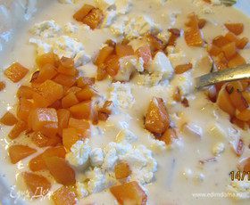 Добавляем ее в тесто, а также раскрошенный козий сыр. Перемешиваем.